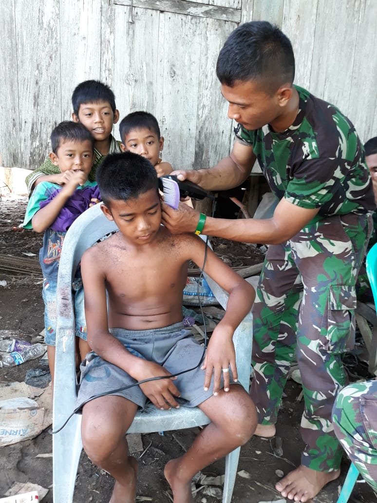 “Kami ingin rapikan rambut anak-anak, supaya lebih rapi dan terlihat ganteng,” ucap salah satu satgas TMMD.