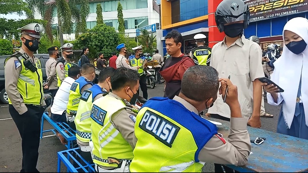 Dari liputan dilapangan, pengendara sepeda motor dan bentor di wajibkan masuk dalam areal Polrestabes Palembang. Satu persatu pengendara tak luput dari pemeriksaan petugas. Anggota pun nampak teliti memeriksa kendaraan dan kelengkapan surat, serta sosialisasi vaksinasi di pandemi covid 19.