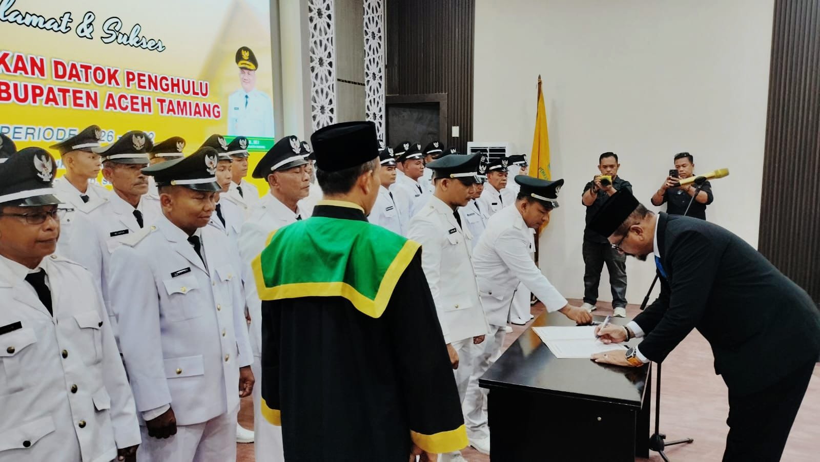 MATTANEWS.CO, ACEH TAMIANG – Sebanyak 29 Datok Penghulu (Kepala Desa, red) di Kabupaten Aceh Tamiang dilantik, Pelantikan dan pengambilan sumpah langsung dipimpin Bupati Aceh Tamiang, Armia Pahmi, Kamis (12/2/2026).