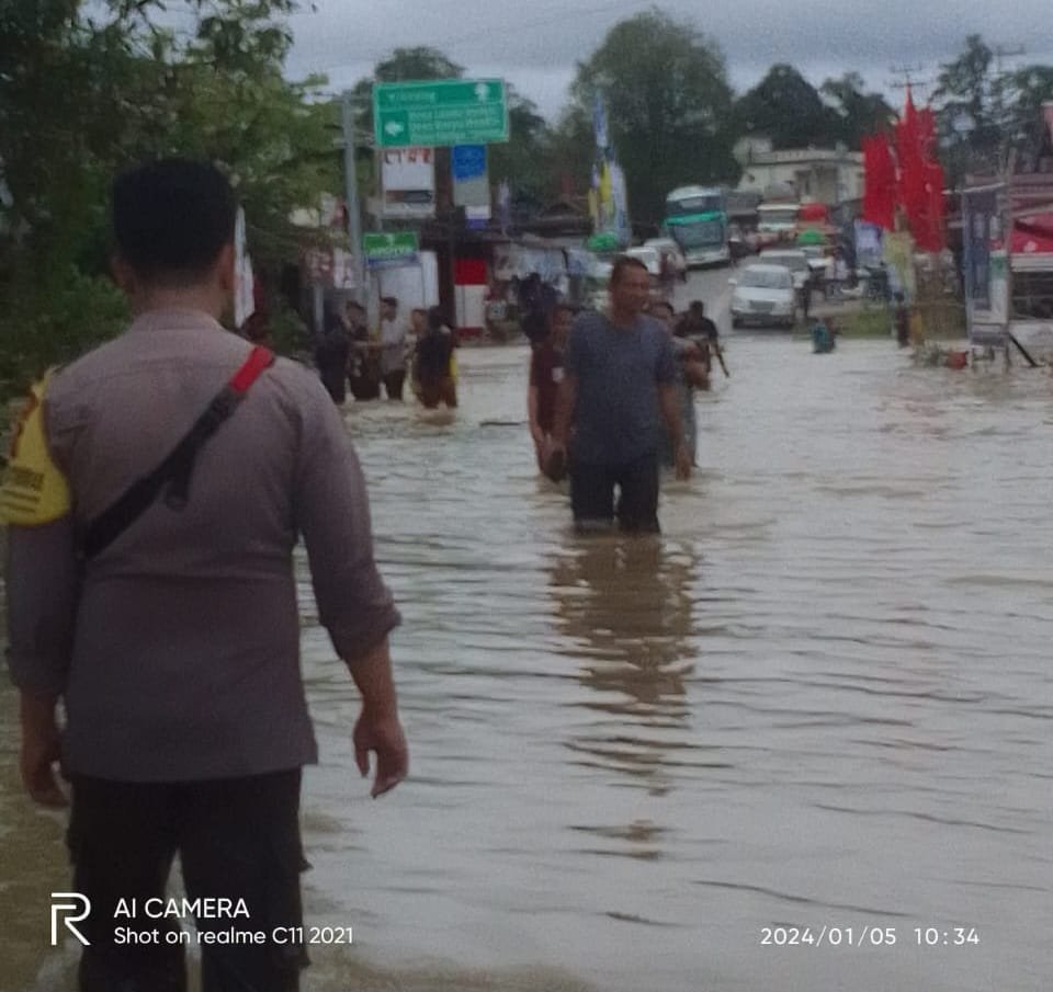 “Hasil monitoring di lapangan menunjukkan terdapat genangan air di jalan, kurang lebih sekitar 100 sentimeter. Hal ini mengakibatkan jalan lintas selatan, yang dilewati oleh masyarakat, terendam banjir,” ungkap Kapolsek.