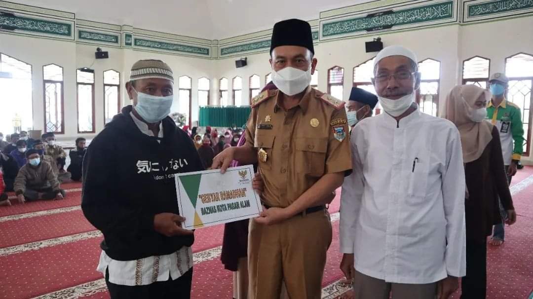 MATTANEWS.CO PAGAR ALAM – Sekretaris Daerah (Sekda) Kota Pagar Alam Samsul Bahri menghadiri sekaligus menyerahkan secara simbolis Pendistribusian Dana Zakat, Infaq dan Sadaqoh dari Badan Amil Zakat Nasional (Baznas) Pagar Alam kepada Mustahiq Zakat, bertempat di Masjid Al-Akbar Gunung Gare Kota Pagar Alam, Senin (25/04/2022).