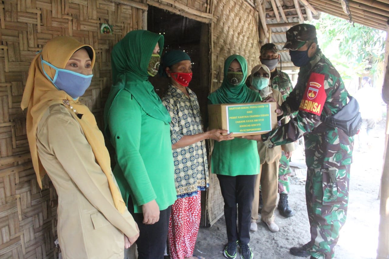 PATI, Mattanews.co – Untuk menyemangati masyarakat agar tetap sabar disituasi pendemi covud 19 ini, Persatuan Istri Tentara TNI-AD (Persit) Kartika Chandra Kirana Cabang XXXIX Kodim 0718 Pati ikut berpartisipasi, untuk meringankan beban masyarakat. Ibu Persit ini memberikan bantuan sosial peduli covid-19 di Desa Bumiayu dan Desa Margorejo Kecamatan Wedarijaksa Pati, Selasa (12/05/2020).