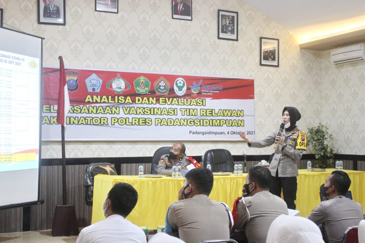 Guna memaksimalkan proses pemberian vaksin ke masyarakat, Kapolres menggelar rapat analisa dan evaluasi pelaksanaan vaksinasi bersama tim relawan vaksinator Polres Padangsidimpuan, Senin (4/10/2021) di Aula Mapolres setempat. Kegiatan diawali dengan paparan dari Kapolres yang menjelaskan tentang capaian vaksinasi selama 8 hari kerja yakni, 5.802 dosis.