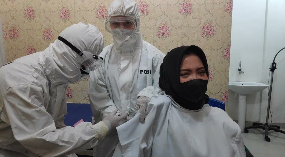 Penyuntikan vaksin perdana ini disaksikan Kapolrestabes Palembang, Kombes Pol Irvan Prawira Satyaputra dan Wakapolrestabes, AKBP Andes Purwanti dan petugas nakes.