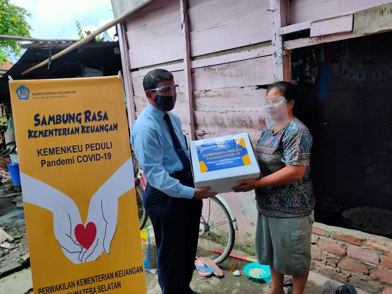 Wajah Eti langsung berbinar-binar dengan senyum yang merekah, ketika dirinya diberikan satu kotak paket sembako dari Kemenkeu Sumsel.