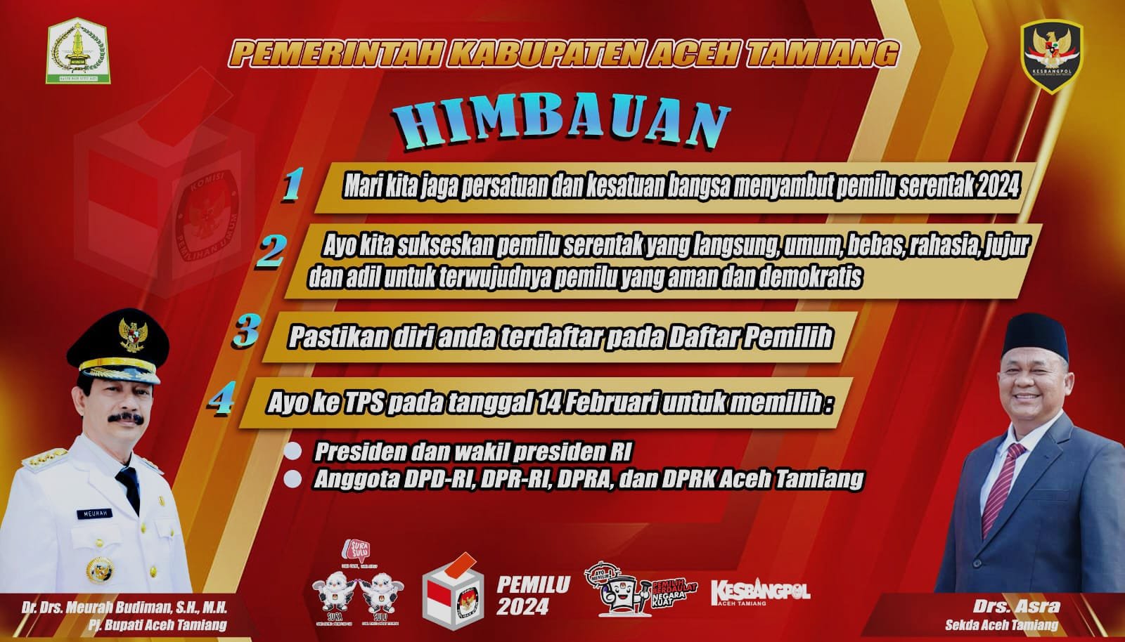 MATTANEWS.CO, ACEH TAMIANG – Penjabat (Pj) Bupati Dr. Drs. Meurah Budiman, SH, MH, dan Sekda Asra mengajak masyarakat Kabupaten Aceh Tamiang agar mensukseskan Pemilihan Umum (Pemilu) Serentak Tahun 2024.