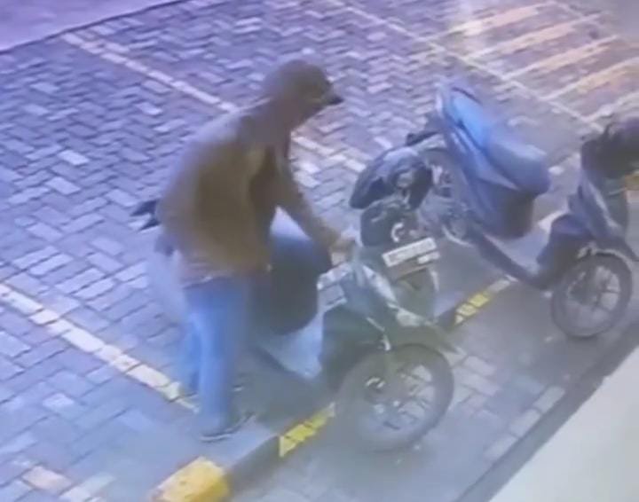 Berdasarkan rekaman tersebut, pelaku memakai jacket hoodie coklat dan topi, langsung berjalan menuju motor Honda Beat BG 3332 AEN milik korban.