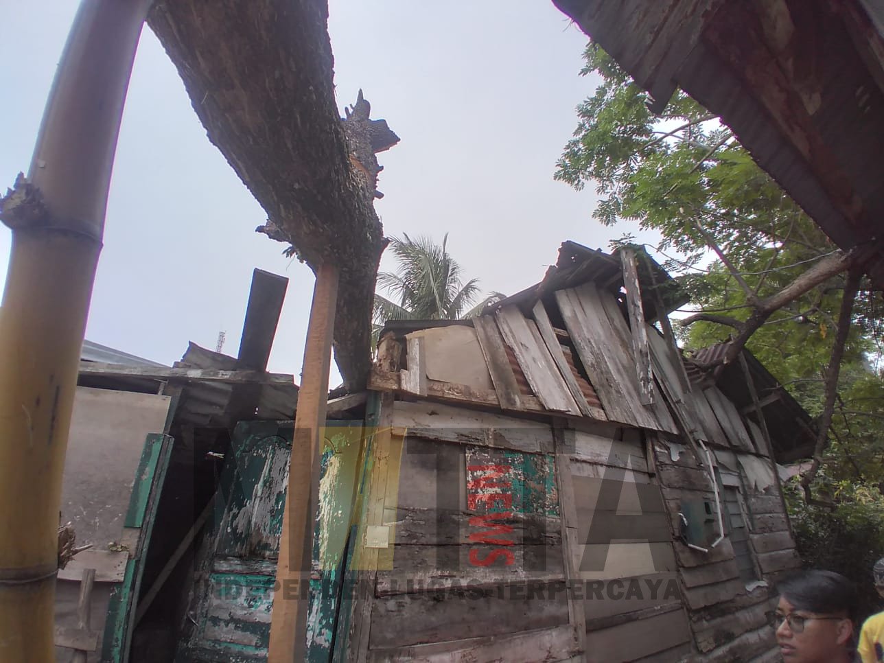 Dan benar saja pada saat di cek atap rumah mereka tertimpa pohon besar yang mengakibatkan kondisi rumah condong ke belakang.