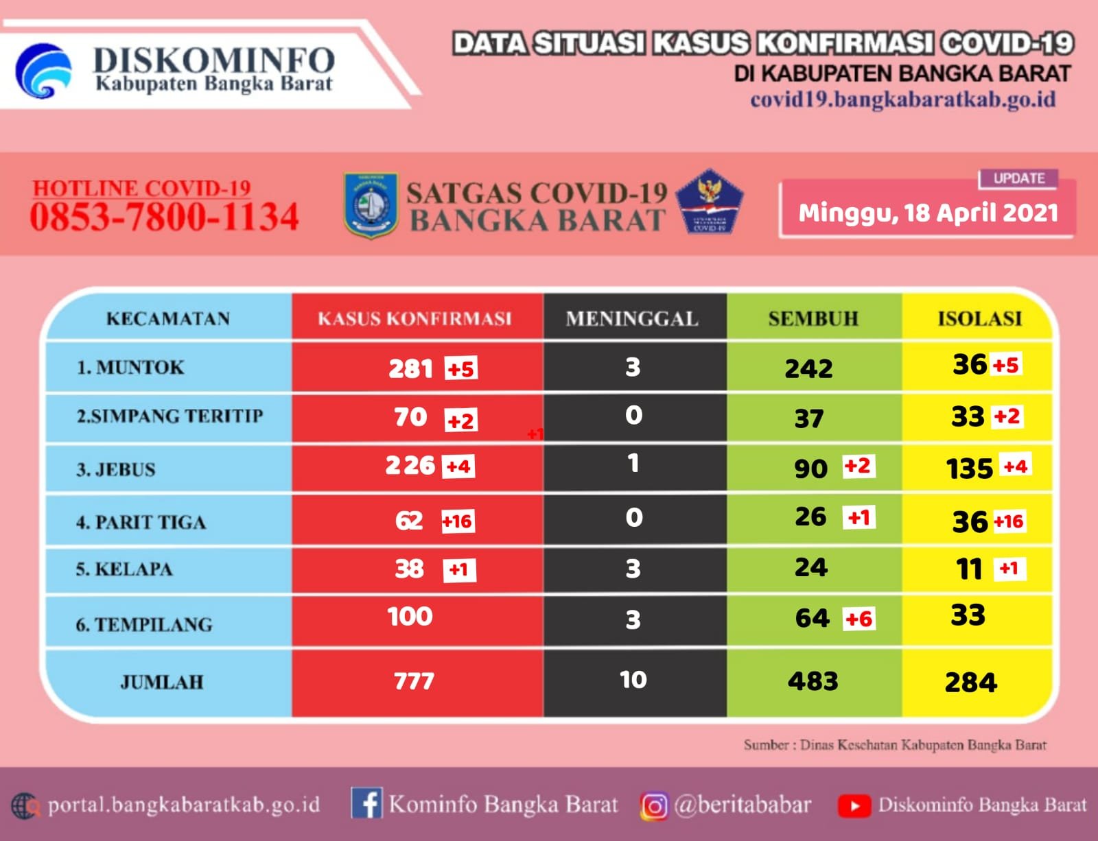 Pasien yang terkonfirmasi positif Covid-19 hari ini menurut data dari Tim Satgas Covid 19 Bangka Barat berjumlah 28 orang yang positif Covid-19, dan sehingga total kasus positif untuk Kabupaten Bangka Barat, hingga Minggu (18/04/2021) sebanyak 777 orang.