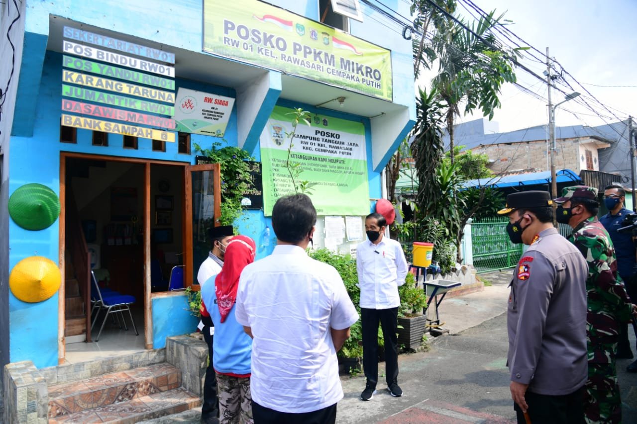 “Saya hadir dadakan ke sini ini di Kelurahan Rawasari, RW 01, Kecamatan Cempaka Putih. Jadi saya memang dadakan ke sini untuk memastikan PPKM mikro itu berjalan atau tidak berjalan. Tadi disampaikan oleh Bu RW dengan yakin berjalan, ya berjalan,” ujar Presiden di lokasi seusai peninjauan.