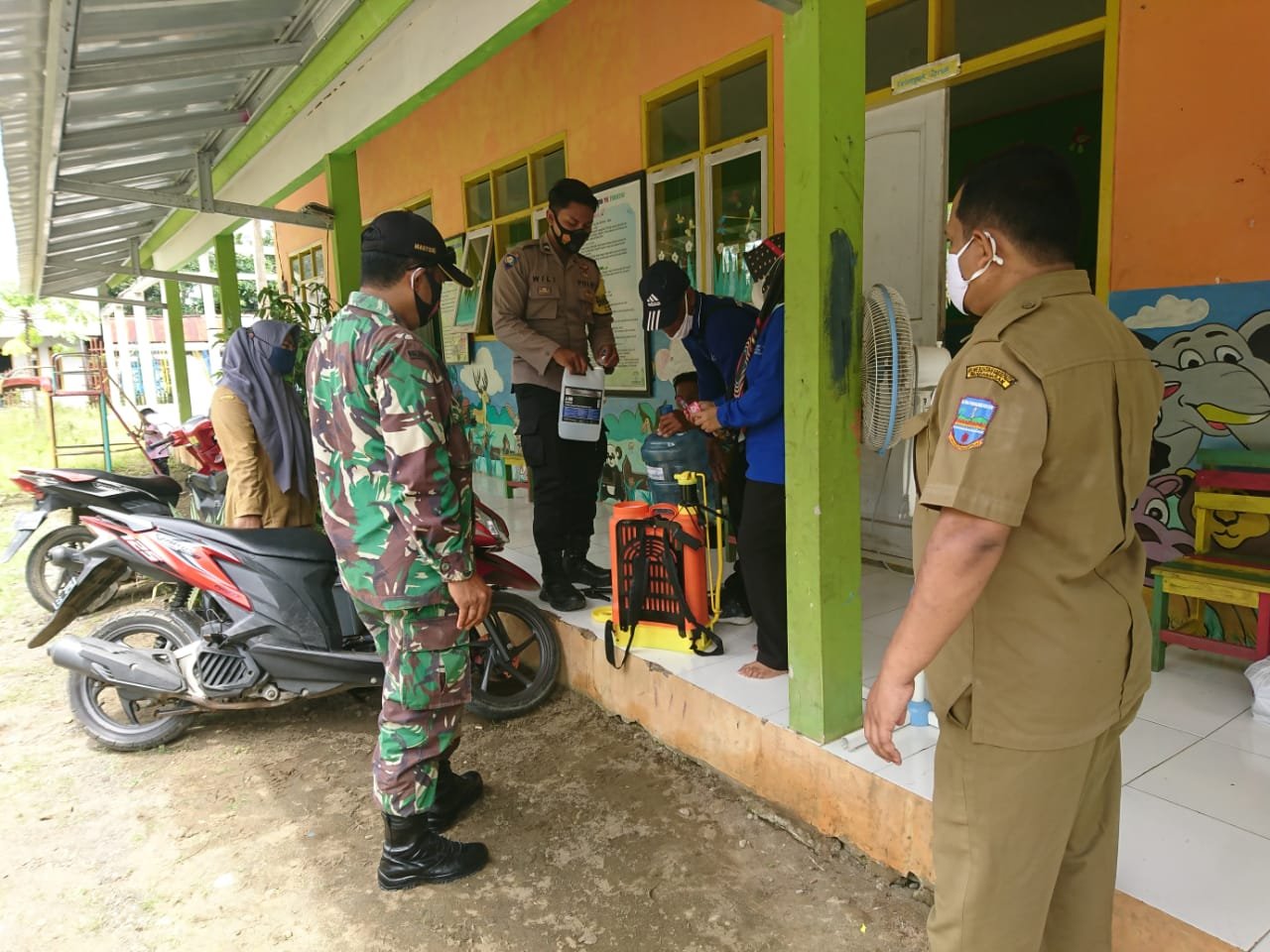 MATTANEWS.CO, PANGANDARAN – Berbagai upaya terus dilakukan melawan penyebaran Covid-19 di Kabupaten Pangandaran Jawa Barat. Salah satunya dengan melaksanakan penyemprotan cairan disinfektan. Langkah ini dilakukan Bhabinkamtibmas Desa Wonoharjo Bripda Wili Prasetia bersama Babinsa dan Kepala Desa serta beberapa perangkat desa dan Kelompok Siaga Becana (KSB) Desa Wonoharjo. Penyemprotan cairan disinfektan kali ini dilaksanakan di seluruh sekolah Taman Kanak-kanak, dan Sekolah Dasar diwilayah Desa Wonoharjo, Kecamatan Pangandaran, Jawa Barat, pada Senin (8/3/2021).