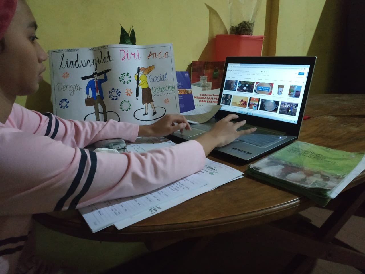 Inan, siswi SLTP 6 Sekayu, tetap mengikuti pelajaran dengan sistem pembelajaran jarak jauh ( PJJ). “Caranya, kami terhubung lewat grup WhatsApp sekolah. Guru mengabsen sesuai pelajaran setiap harinya. Kami diberi tugas dan mengerjakan soal di buku tulis. Selanjutnya difoto dan hasil jawaban atau tugas itu kami kirimkan kepada guru kelas,” jelas dia saat ditemui sedang belajar di depan laptop.