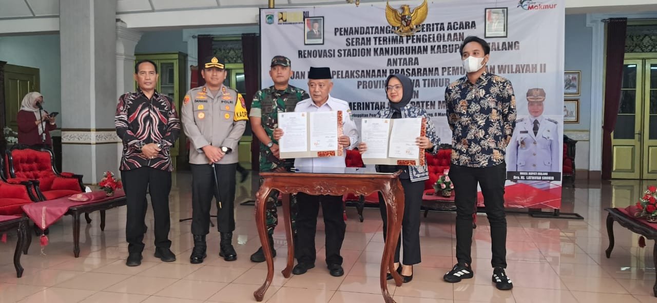 Penyerahan mengelolahan Stadion Kanjuruhan Kabupaten Malang ditandai dengan serah terima dan penandatanganan Berita Acara Serah Terima (BAST) di Pendopo Agung Kabupaten Malang.