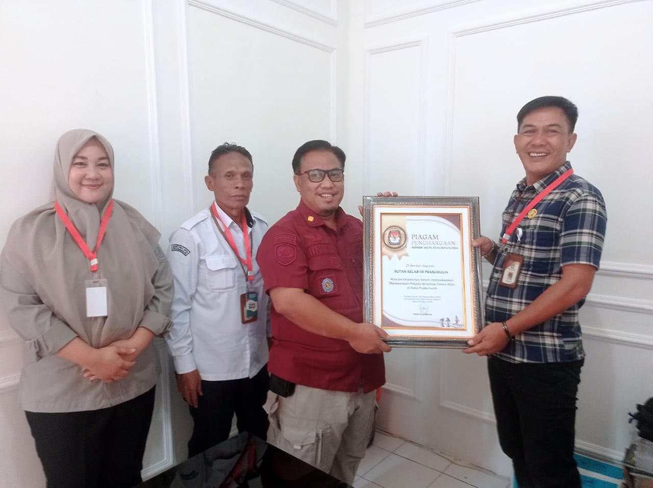 Penghargaan diserahkan langsung oleh KPU Prabumulih kepada Pelaksana Harian Kepala Rutan (Plh.Karutan) Prabumulih Iin Valentino SH diruang kerjanya, Kamis (16/1/2025).