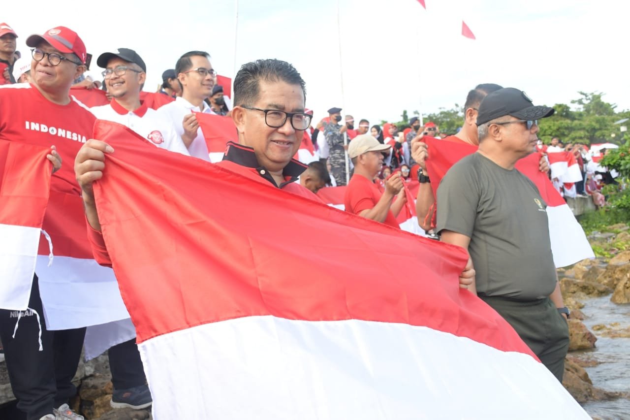 “Pagi ini, bersama- sama Forkopimda telah menyeberangkan sangsaka merah putih sejauh 2 kilometer. Ini adalah pengibaran bendera 21×11 meter, pertama di Indonesia. Ini aksi heroik,” ujar Pj Gubernur Sulbar Akmal Malik.