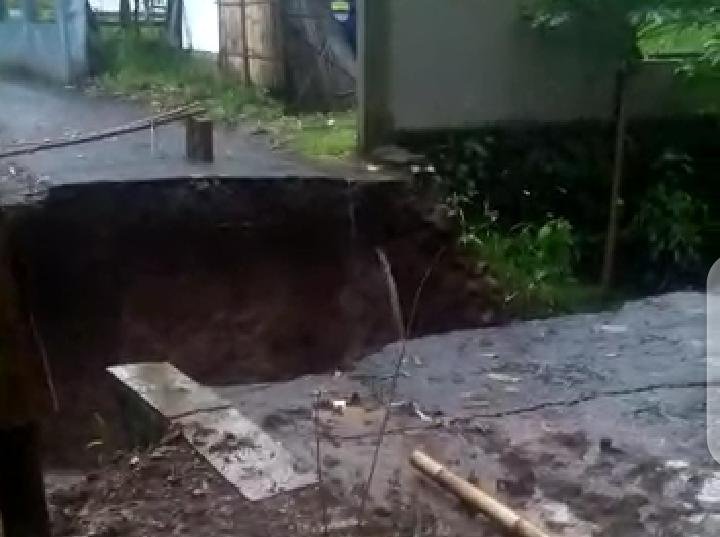 “Longsoran tersebut menutupi gorong-gorong saluran air sungai dibawah jembatan sehingga air meluap menggenangi kolam ikan milik warga sekitar serta memutus saluran pipa PDAM.akibat dari hujan yang sangat deras debit air yang meluap semakin tinggi dan material longsoran yang menyumbat gorong-gorong akhirnya tidak kuat lagi menahan deras nya arus air sehingga pada pukul 18.00 WIB jembatan tersebut putus akibat terkikis oleh derasnya arus air,” ungkapnya.