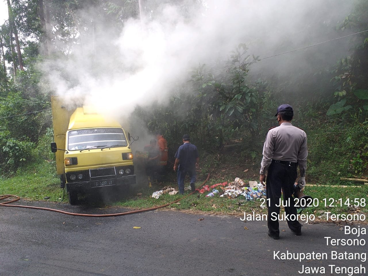 BATANG,Mattanews.co – Truk Box bernopol G 1407 LB, warna kuning, bermuatan makanan ringan terbakar di Jalan Raya Tersono – Bawang masuk Desa Boja Kecamatan Tersono Kabupaten Batang.
