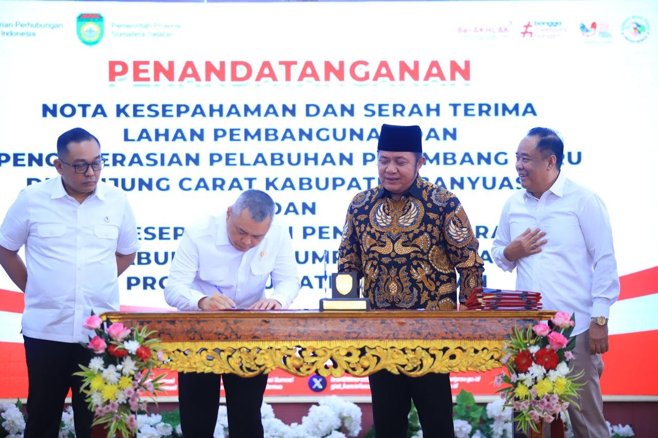 Langkah bersejarah ini ditandai dengan penandatanganan Nota Kesepahaman (MoU) dan serah terima lahan pembangunan pelabuhan antara Pemerintah Provinsi Sumsel dan Kementerian Perhubungan Republik Indonesia (Kemenhub RI) di Griya Agung Palembang, Jumat (31/10/2025).