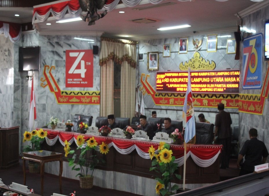 LAMPUNG UTARA, Mattanews.co – Ketua DPRD Kabupaten Lampung Utara, Romli, A.Md, memimpin Rapat Paripurna Internal mengenai Laporan Hasil Pembahasan Panitia Khusus DPRD Kabupaten Lampung Utara tentang Rancangan Keputusan DPRD Kabupaten Lampung Utara Tentang Tata Tertib DPRD Kabupaten Lampung Utara Masa Keanggotaan 2019-2024, Senin (27/01/2020).