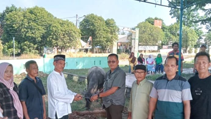 H. Arlan menyerahkan hewan qurban tersebut ke Ketua Adat Masyarakat Tanjung Raman Kecamatan Prabumulih Selatan yaitu bapak Samarudin disaksikan ketua RT. 06 Basyarudi dan warga di Lapangan Gedung Serba Guna Kelurahan Tanjung Raman, Rabu (28/6/2023) siang.