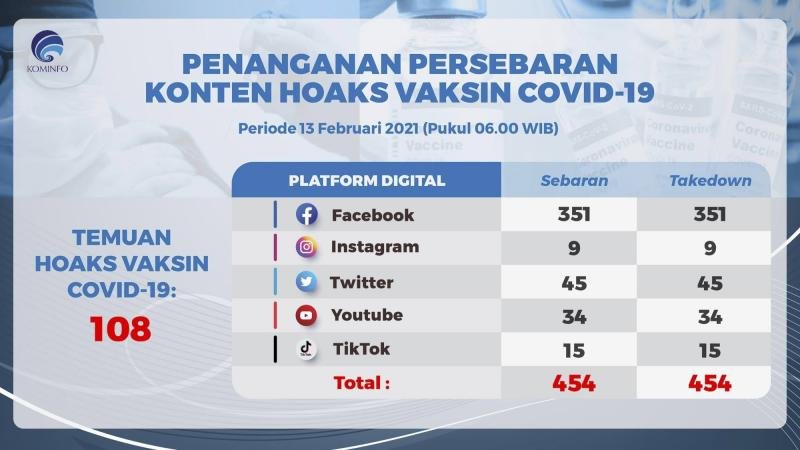 MATTANEWS.CO, JAKARTA– Kementerian Komunikasi dan Informatika (Kominfo) kembali merilis temuan Hoax Vaksin Covid-19. Per hari Sabtu (13/2/2021) ada 108 temuan isu hoax vaksin Covid-19 yang tersebar di lima platform media sosial.