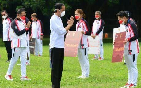 MATTANEWS.CO, JAKARTA– Presiden Joko Widodo menerima kontingen Indonesia yang berlaga di Olimpiade Tokyo 2020, sekaligus menyerahkan bonus apresiasi bagi para atlet dan para pelatih. Acara tersebut digelar dengan menerapkan protokol kesehatan yang ketat di halaman Istana Kepresidenan Bogor, Jawa Barat, pada Jumat, (13/8/2021).