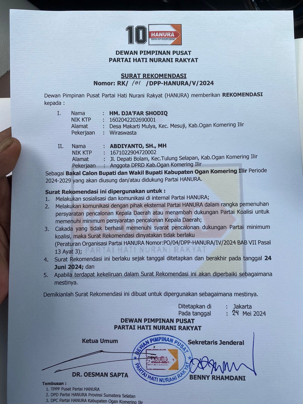 Ketua DPC Partai Hanura OKI, Depit Alipia menyatakan bahwa semua kandidat balon bupati dan wakil bupati yang serius dalam penjaringan diberi rekomendasi oleh DPP Partai Hanura.