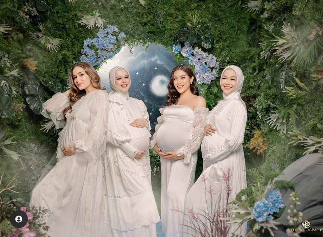 Keempat bumil ini menampilkan pesona mereka masing-masing dalam balutan gaun serba putih, terlihat aura mereka sebagai ibu hamil.