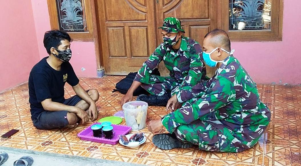 Sertu Mukhamad Niti yang pernah terlibat satgas TMMD di Desa Sendang Kulon, masih menyempatkan waktunya untuk bersilaturahim ke rumah Ardy (35) Warga Desa Sendang Kulon yang pernah ikut membantu giat TMMD.