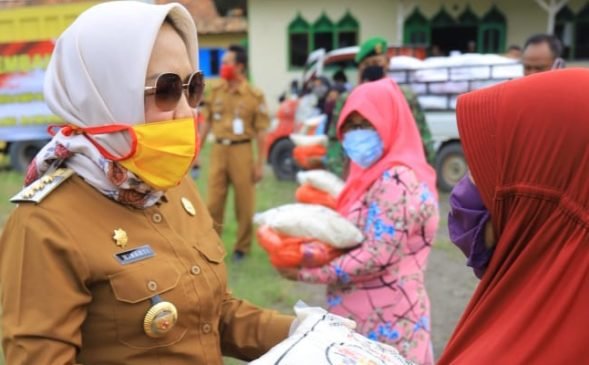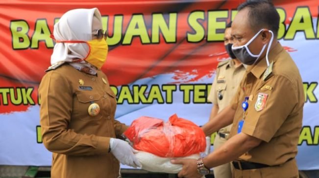 TULANG BAWANG, Mattanews.co – Sedikitnya 3.385 paket sembako diserahkan Bupati Tulang Bawang, Winarti ke warga Kecamatan Menggala, yang terkena dampak covid 19. Bantuan diserahkan secara simbolis ke Lurah di Kecamatan Menggala dan perwakilan masyarakat penerima di Kampung Bugis Menggala, Senin (04/05/2020).
