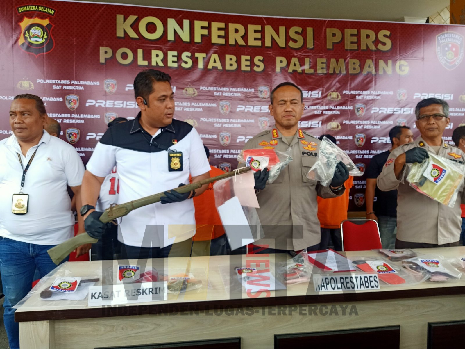 “Masih dalam Operasi Senpi Musi 2023, kita berhasil mengamankan tiga tersangka senpi rakitan, baik laras pendek maupun panjang, dari dua orang, yang memang sudah menjadi Target Operasi (TO) kami dan satu pelaku bukan TO. Selain itu, ada juga senpi rakitan serahan dari masyarakat,” ungkap Kapolrestabes Palembang, Kombes Pol Mokhammad Ngajib didampingi Kasat Reskrim, AKBP Haris Dinzah, saat press release.