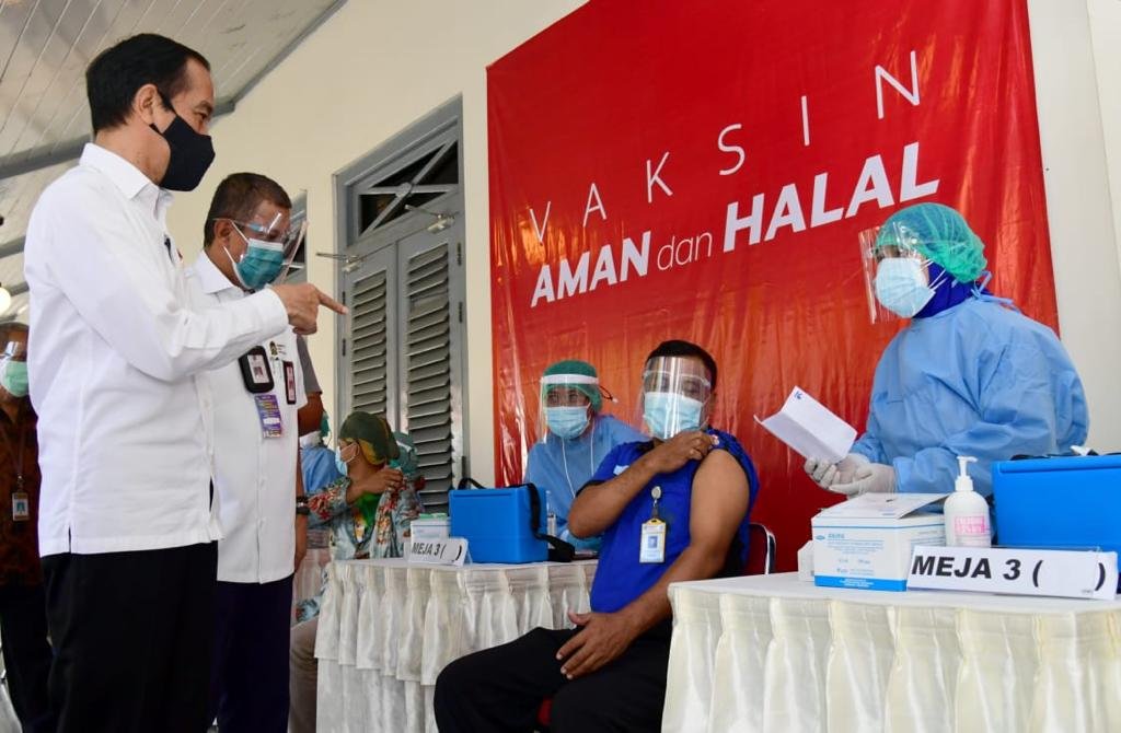 Presiden didampingi Menteri Sekretaris Negara Pratikno, Menteri Kesehatan Budi Gunadi Sadikin, Gubernur DIY Sri Sultan Hamengkubuwono X, dan Wali Kota Yogyakarta Haryadi Suyuti meninjau dua lokasi vaksinasi massal yaitu Pasar Beringharjo dan Museum Benteng Vredeburg.