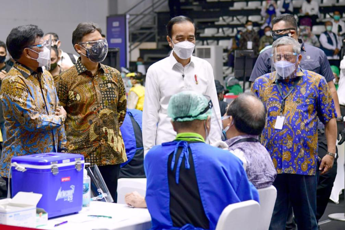 Kepala Negara dengan didampingi oleh Menteri Kesehatan Budi Gunadi Sadikin, Menteri Komunikasi dan Informatika Johnny G. Plate, dan Ketua Dewan Pers Mohammad Nuh langsung melakukan proses jalannya proses vaksinasi setibanya di lokasi sekira pukul 09.10 WIB.
