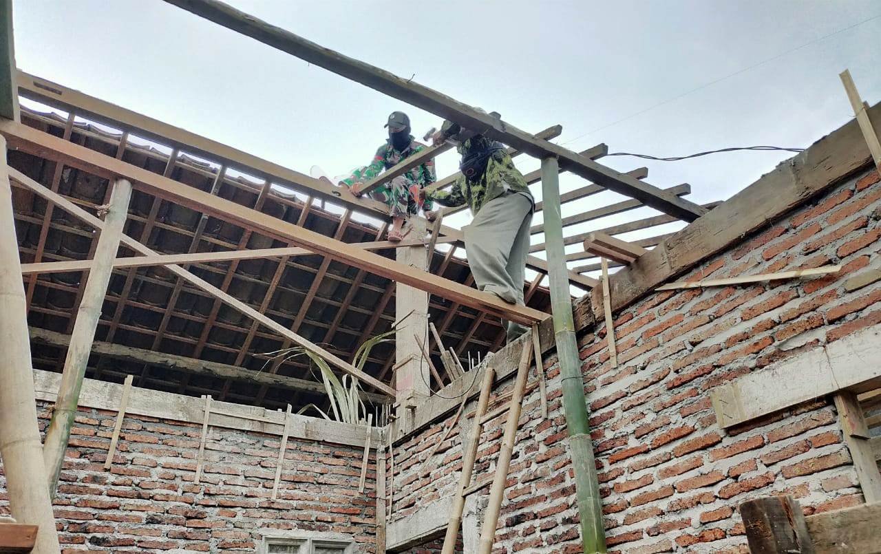 Seperti halnya di pengerjaan perehaban Rumah Tidak Layak Huni (RTLH) milik ibu Ulil, warga Desa Sendang Kulon, salah satu warga yang mendapat jatah rehab RTLH dalam program TMMD Reguler 108 Kodim 0715/Kendal, TNI Satgas dan warga terus kebut pemasangan kayu usuk di rumah itu.