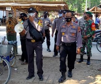 Sejumlah personel gabungan baik dari personil TNI dan Polri berbekal pengeras suara berkeliling pasar memberikan sosialisasi terkait protokol kesehatan guna mencegah corona.