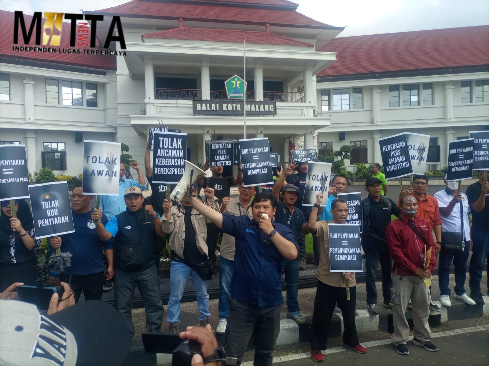 MATTANEWS.CO, KOTA MALANG – Ratusan Jurnalis Malang Raya yang tergabung dari Organisasi Pers (PWI, AJI, IJTI, PDI dan lainya) menggelar aksi damai, di depan Kantor Wali Kota dan Kantor DPRD Kota Malang pada Jum’at (17/5/2024).