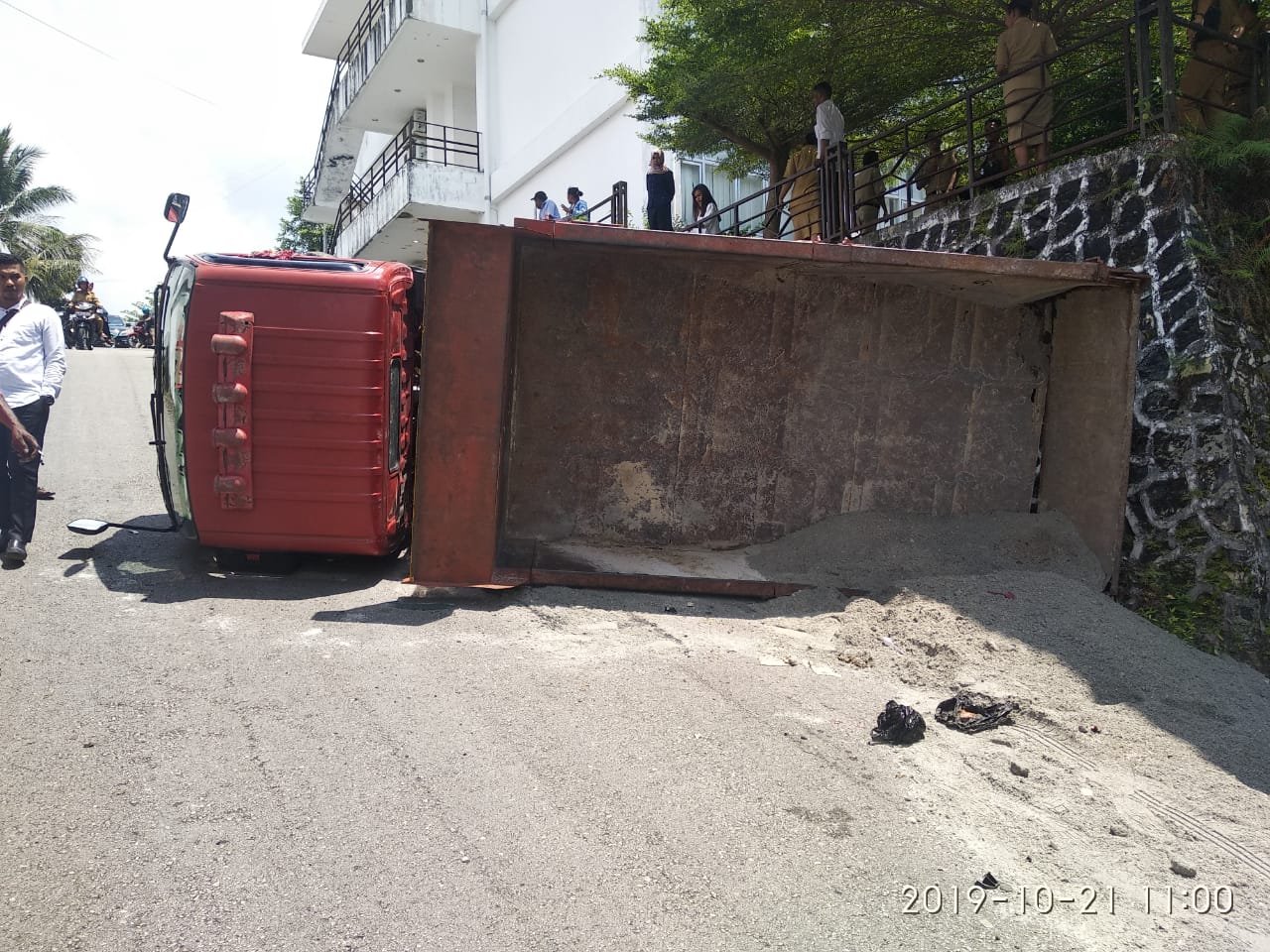 FAKFAK, PAPUA, Mattanews.co – Truk pengangkut pasir dengan No Polisi PB 9096 F terbalik di ruas jalan lingkungan Pemda Fakfak, tepatnya di samping kantor Badan Kepegawaian dan Pengembangan Sumber Daya Aparatur (BKPSDA), Senin (2/10/ 2019).