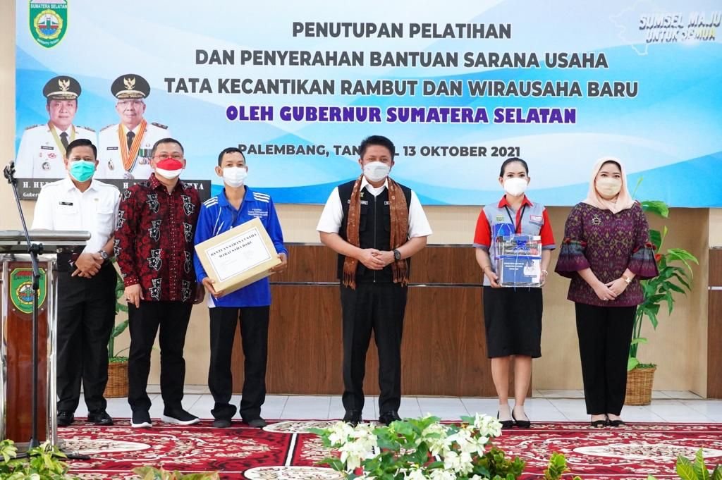 Gubernur Herman Deru yang juga didampingi Ketua Koordinator Wilayah Indernasional Council For Small Busniess (ICSB) Sumatera Selatan, Hj. Samantha Tivani Herman Deru yang saat itu berkesempatan menyerahkan bantuan untuk para pelaku usaha yang ikut pelatihan tersebut berupa gerobak dan peralatan tata kecantikan.