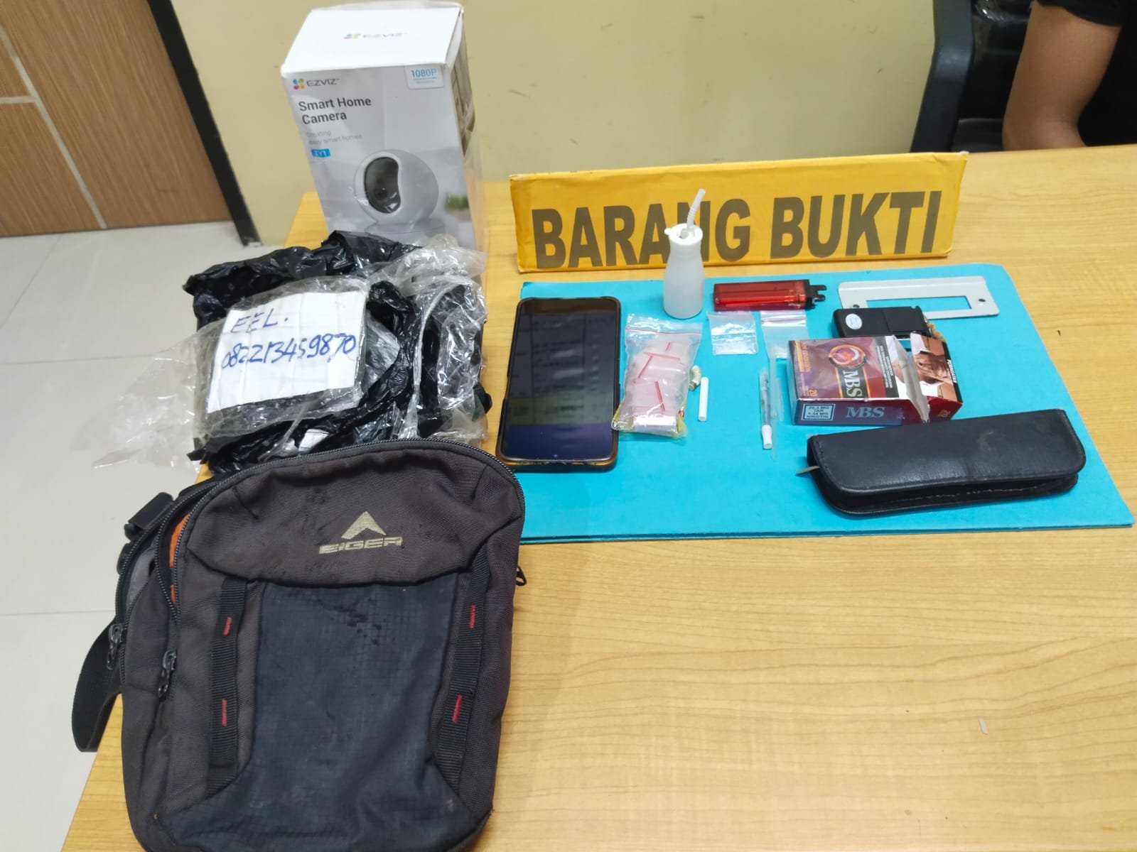 Kemudian 2 (dua) buah pipet untuk sendok , 1 (satu) buah kaca Pirex, 1 (satu) potong pipet, 1 (satu) buah kotak cctv warna putih, 3 (tiga) helai celana dalam untuk membalut shabu, 1 (satu) buah tas warna hitam dengan merk EIGER, 1 (satu) unit Hp OPPO warna kuning tipe A77 s dengan case warna hitam terpasang, 1 (satu) buah Dompet kecil warna hitam untuk menyimpan alat hisap (bong), dan 1 (satu) buah kantong warna hitam dengan lak warna putih untuk Paketan Shabu.