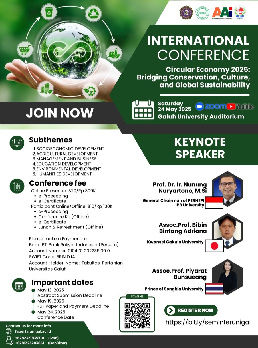 MATTANEWS.CO, CIAMIS – Dalam upaya menghadirkan solusi konkret terhadap krisis iklim dan kelangkaan sumber daya, Fakultas Pertanian Universitas Galuh (UNIGAL) mengambil langkah strategis dengan menyelenggarakan seminar internasional bertajuk “Circular Economy 2025: Bridging Conservation, Culture, and Global Sustainability” pada Sabtu, 24 Mei 2025 pukul 08.00-16.00 WIB di Jl. RE Martadinata No. 150, Auditorium UNIGAL, Kabupaten Ciamis, Jawa Barat, serta dapat diikuti secara daring melalui platform Zoom.