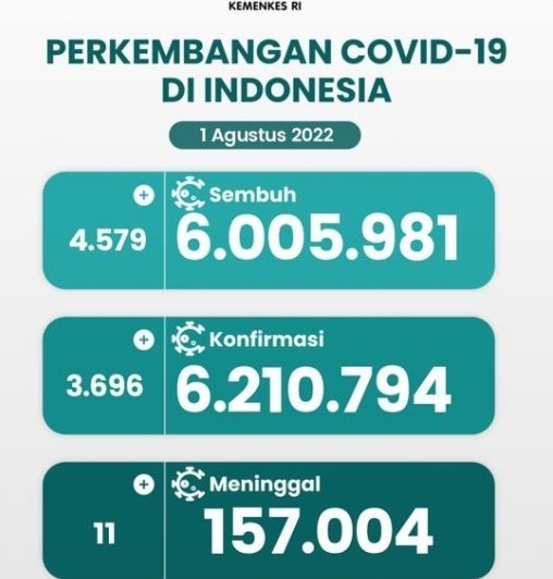 Update 1 Agustus 2022 Korban Covid-19 di Indonesia: 6.210.794 Positif, 6.005.981 Sembuh, 157.004 Meninggal