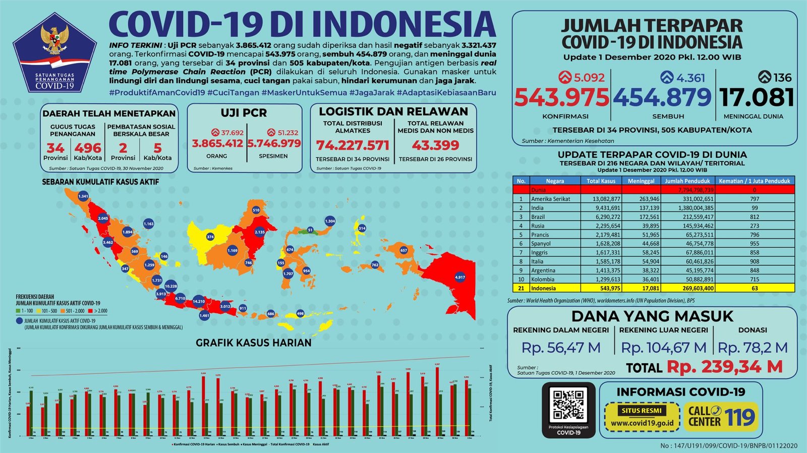 JAKARTA, Mattanews.co– Pemerintah merilis kembali data akumulasi terbaru terkait sebaran kasus Virus Corona (Covid-19). Hingga Selasa (1/12/2020), Jumlah kasus positif virus corona (Covid-19) di Indonesia terus meningkat, bertambah 5.092 Kasus Baru Sehingga total yang positif mencapai 543.975 kasus.