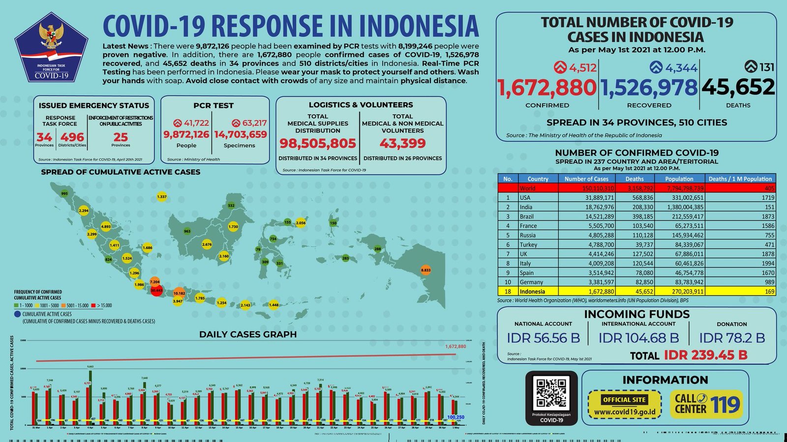 Dikutip dari situs covid19.go.id, Dari jumlah 1.672.880 Kasus ada penambahan 4.512 Kasus Positif, ada penambahan kasus kematian yakni 131 jiwa sehingga total menjadi 45.652 jiwa dan 1.526.978 pasien dinyatakan sembuh. Sementara jumlah pasien yang sembuh sejauh ini bertambah 4.344 orang sehingga total mencapai 1.526.978 orang.