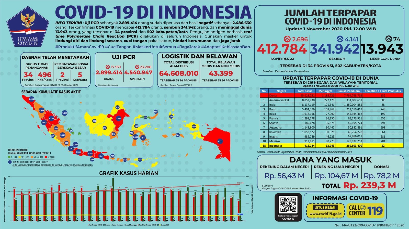 Update 1 November 2020 Korban Covid-19 di Indonesia: 412.784 Positif, 341.942 Sembuh, 13.943 Meninggal