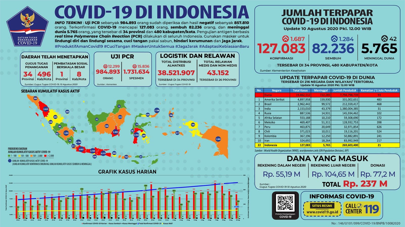 Dikutip dari situs covid19.go.id, Dari jumlah 127.083 Kasus ada penambahan 1.687 Kasus Positif, ada penambahan kasus kematian yakni 42 jiwa sehingga total menjadi 5.765 jiwa dan 82.236 pasien dinyatakan sembuh. Sementara jumlah pasien yang sembuh sejauh ini bertambah 1.284 orang sehingga total mencapai 82.236 orang.