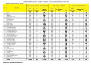 Data pasien Corona (Covid-19) ini tercatat sejak Minggu, 9 Agustus 2020 pukul 12.00 WIB hingga hari ini, Senin, 10 Agustus 2020 pukul 12.00 WIB.