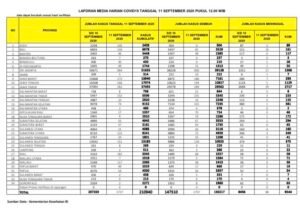 Dari data yang disampaikan Kementerian Kesehatan RI pada hari Jum’at 11 September 2020, berikut ini 11 provinsi yang menambahkan kasus baru di atas 100 pada hari ini :