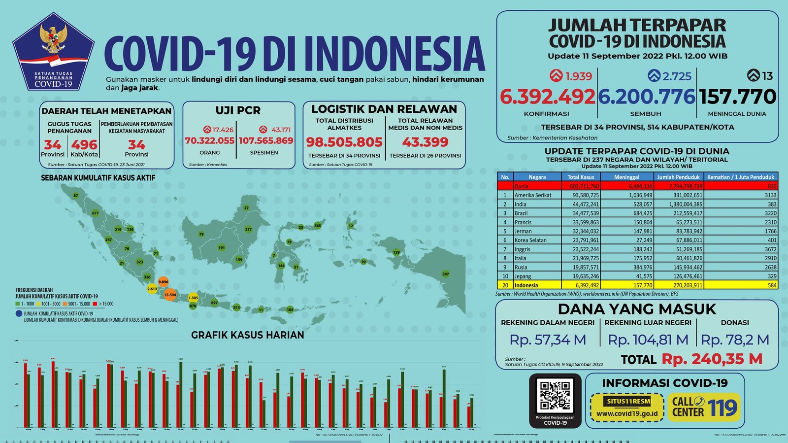Sebelumnya pada Sabtu (10/9/2022), jumlah akumulatif kasus positif berada di angka 6.390.553 dengan 6.198.051 di antaranya sembuh dan 157.757 meninggal dunia.