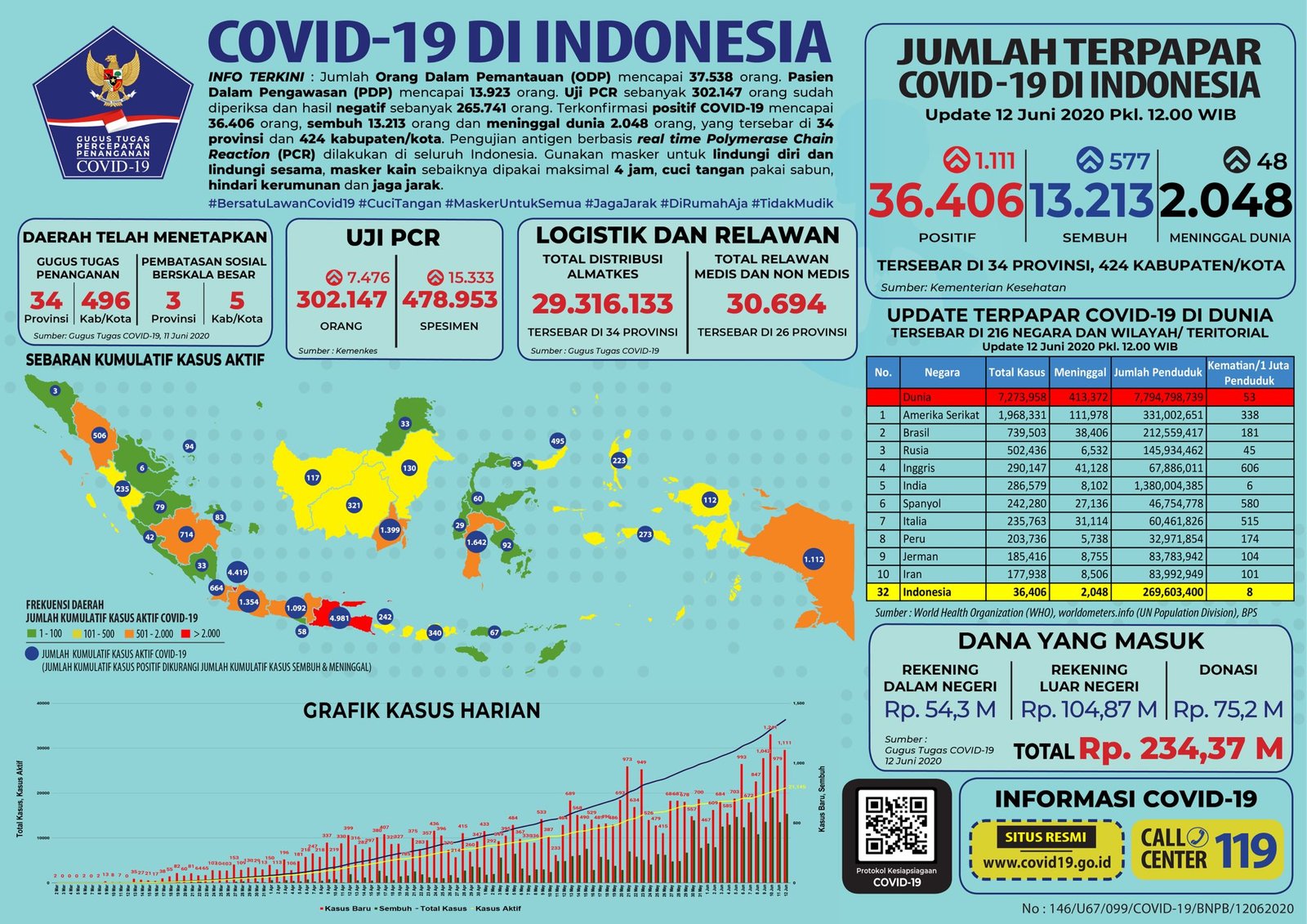JAKARTA, Mattanews.co– Pemerintah merilis kembali data akumulasi terbaru terkait sebaran kasus Virus Corona (Covid-19). Hingga Jumat (12/6/2020), Jumlah kasus positif virus corona (Covid-19) di Indonesia terus meningkat, bertambah 1.111 Kasus Baru Sehingga total yang positif mencapai 36.406 kasus.