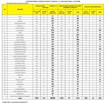 Data pasien Corona (Covid-19) ini tercatat sejak Kamis 11 Juni 2020 pukul 12.00 WIB hingga hari ini Jumat 12 Juni 2020 pukul 12.00 WIB.